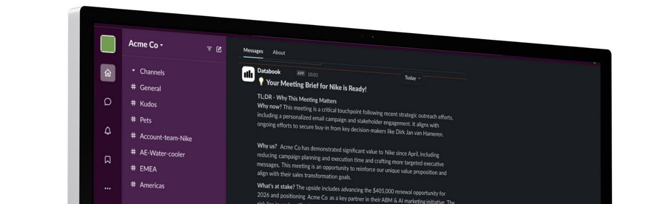 - Proactive nudges that keep deals on track in DatabookAI, Slack, and Teams